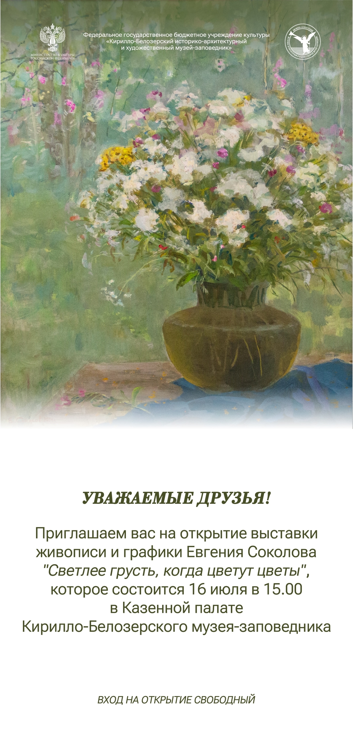 На выставке в Казенной палате представлены работы заслуженного художника РФ – Евгения Александровича Соколова. Участник художественных выставок с 1959 года. С 1964 года – член Союза художников СССР. Произведения экспонируются на всероссийских, межрегиональных, областных, международных художественных выставках. Персональные выставки живописи проходили в Москве (2004), Вологде (1978, 1986, 1987, 1990, 1997, 2002, 2005, 2007, 2010, 2012), Череповце (1963), Белозерске (2013), Германии (1991, 1992, 1994, 1997, 1999, 2000, 2006, 2010), Норвегии (1996), Италии(1991, 1999), Греции (2005). Постоянно живёт и работает в Вологде с 1979 года. Произведения художника находятся в Вологодской областной картинной галерее, Череповецком музейном объединении, музеях-заповедниках и краеведческих музеях Вологодской области, в частных коллекциях в России и за рубежом. Художник работает в технике масляной и темперной живописи в жанрах пейзажа, натюрморта, сюжетно-тематической и бытовой картины.