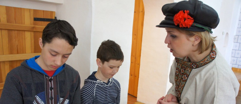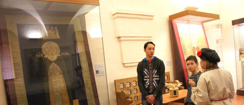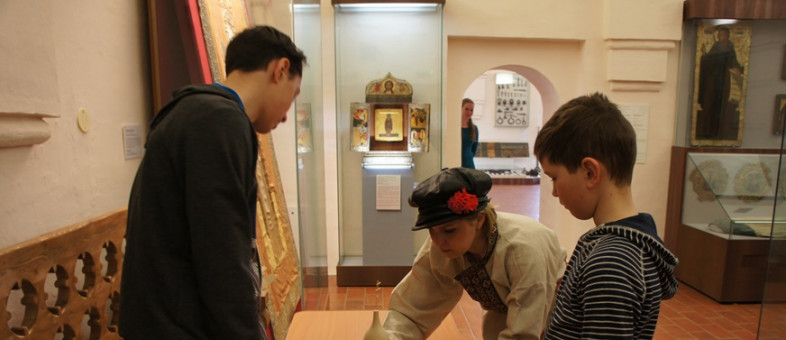Участники квеста смогли не только попрактиковаться в ловкости в игре «Рыбалка», но и показать свою аккуратность, прилежность и трудолюбие в вышивании и каллиграфии. В зале, где представлено шитьё, они смогли вручную пришить бусинку к материи. После увиденной плащаницы «Положение во гроб», которую монастырю в 1645 году подарил граф Ф.И. Шереметев, отказаться от этого задания не смел никто. Мальчишки взяли в руки пяльца и сделали несколько аккуратных стежков.