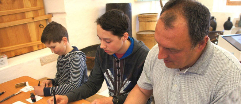 Внимание приковали и книги, представленные на экспозиции. Здесь служебники, «Евангелие»… А вот на столике, где ждёт новое задание, - перьевые ручки и незаполненные открытки. «О-о, да я такими в школе каждый день писал», - решил поучаствовать вместе с детьми один из родителей. Без ошибок и клякс он написал приглашение на чай своему другу, в то время, как мальчишки, в первый раз державшие перо, с завистью поглядывали на него – у них-то без клякс не вышло.