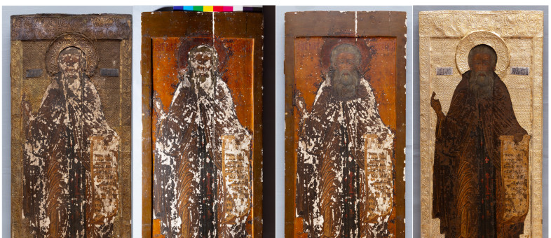 «Около двух лет понадобилось трём вологодским реставраторам, чтобы восстановить икону XVII столетия, которая изначально находилась в иконостасе надвратной церкви 1595 года основания. В музей памятник древнерусской живописи поступил в остро аварийном состоянии. Серебряный оклад с позолотой был «спрятан» под слоем вековой коррозии, от лика святого до нас дошли только малые части – фрагменты глаза, носа, губы… Красочный слой иконы был почти полностью утрачен, – сообщает генеральный директор Кирилло-Белозерского музея-заповедника Михаил Шаромазов. – То, что удалось сделать художнику реставратору темперной живописи Ивану Николаевичу Федышину, художнику-реставратору произведений из металла Светлане Михайловне Смирновой и заведующему отделом реставрации темперной живописи, художнику-реставратору Николаю Петухову, можно назвать чудом и верхом профессионализма. Реставраторы вернули к жизни намоленную и одну из самых почитаемых икон Кирилло-Белозерского монастыря».