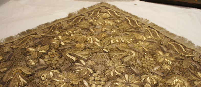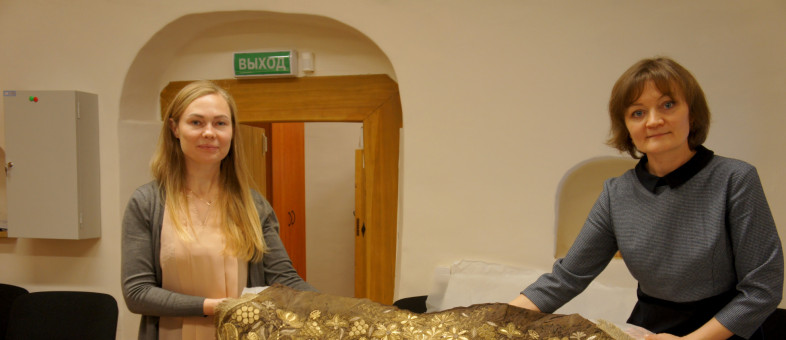 «Драгоценный шёлковый платок с золотными и серебряными нитями, датированный началом XIX века, размером 77 на 122 сантиметра вернулся из Суздальского филиала СПбГИК, – рассказывает заместитель генерального директор Кирилло-Белозерского музея-заповедника по хранению Светлана Смирнова. – Известно, что памятник более 200 лет назад был вышит вручную, и только в прошлом году поступил в фонд Кирилло-Белозерского музея. Такие золотошвейные платки бытовали в Нижегородской губернии, как праздничный женский головной убор. Этот платок стал единственным в коллекции федерального музея. Восстановить первоначальный вид экспоната удалось благодаря усилиям реставратора Валентины Ворониной под руководством реставратора по ткани высшей категории Людмилы Михайловны Громыко».