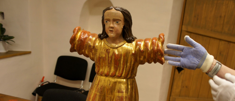 Несказанно рады в музее возвращению скульптуры ангела и неизвестного святого, созданных из дерева в XIX веке. Реставратор Костромского филиала ВХРНЦ им. Академика И.Э. Грабаря Александр Рыбцов смог отреставрировать и законсервировать позолоченные фигуры. Совсем скоро посетители Кирилло-Белозерского музея-заповедника смогут увидеть их на выставке в Казенной палате «Красота резного образа».