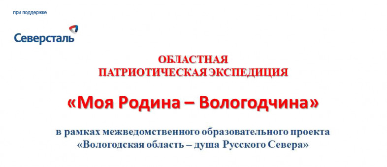 Областная патриотическая экспедиция «Моя Родина – Вологодчина» проводилась с 13 ноября 2018 года по 1 сентября 2019 года с целью создания условий для освоения обучающимися образовательных организаций области духовных, культурных, природных ценностей и трудовых традиций родного края.
