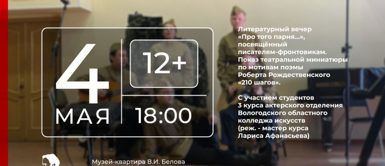 В преддверии Дня Победы филиал Кирилло-Белозерского музея-заповедника «Музей-квартира В.И. Белова» приглашает на литературный вечер «Про того парня...», посвящённый писателям-фронтовикам.
