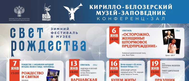 «С 6 по 19 января в нашем музее будет представлена программа для разных категорий посетителей, – сообщает генеральный директор Кирилло-Белозерского музея-заповедника Михаил Шаромазов. – Участников зимнего фестиваля ждет спектакль Вологодского камерного драматического театра под руководством режиссера Якова Рубина, творческий вечер «Будем жить» актера Театра драмы и комедии на Таганке, исполнителя ролей в кино и телесериалах Александра Цуркана. Зрителю он известен по фильмам «Две судьбы», «Александровский сад-2», «Громовы»…