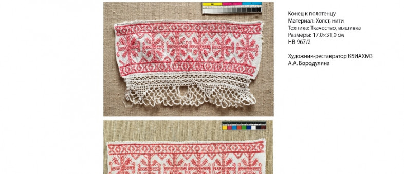 Большая часть предметов была отреставрирована сотрудниками Кирилло-Белозерского музея-заповедника. Художник-реставратор А.А. Бородулина представила два предмета из коллекции «Народные ткани», по которым были завершены реставрационные работы. Это парные концы к полотенцу, выполненные из льняного полотна, декорированного вышивкой красными нитями и кружевом, вязаным крючком. Предметы поступили на реставрацию со значительной деформацией, с загрязнениями и утратами. В результате реставрации памятники выведены из аварийного состояния и имеют экспозиционный вид.